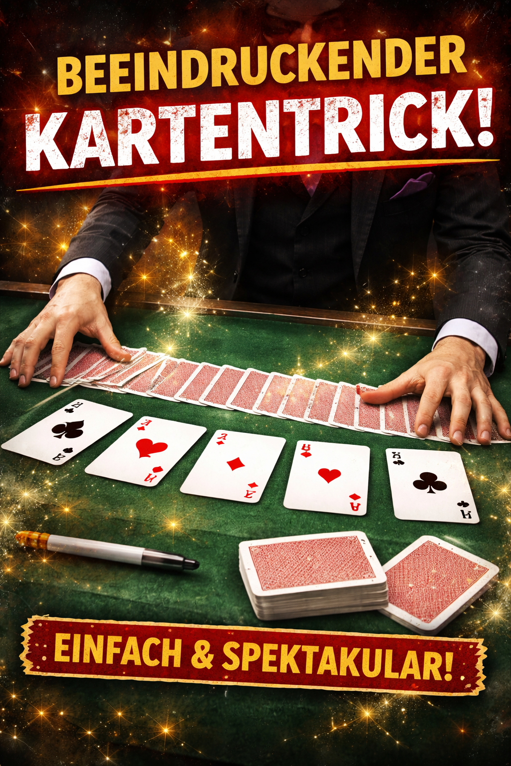 Zum Schluss bestimmen die Zuschauer, welches Päckchen auf welches gelegt wird. Der Magier vollführt eine magische Geste, breitet die Karten aus – und die einzigen vier Karten, die nun mit der Bildseite nach oben liegen, sind die gezogenen Karten der Zuschauer (bzw. markierten Karten).